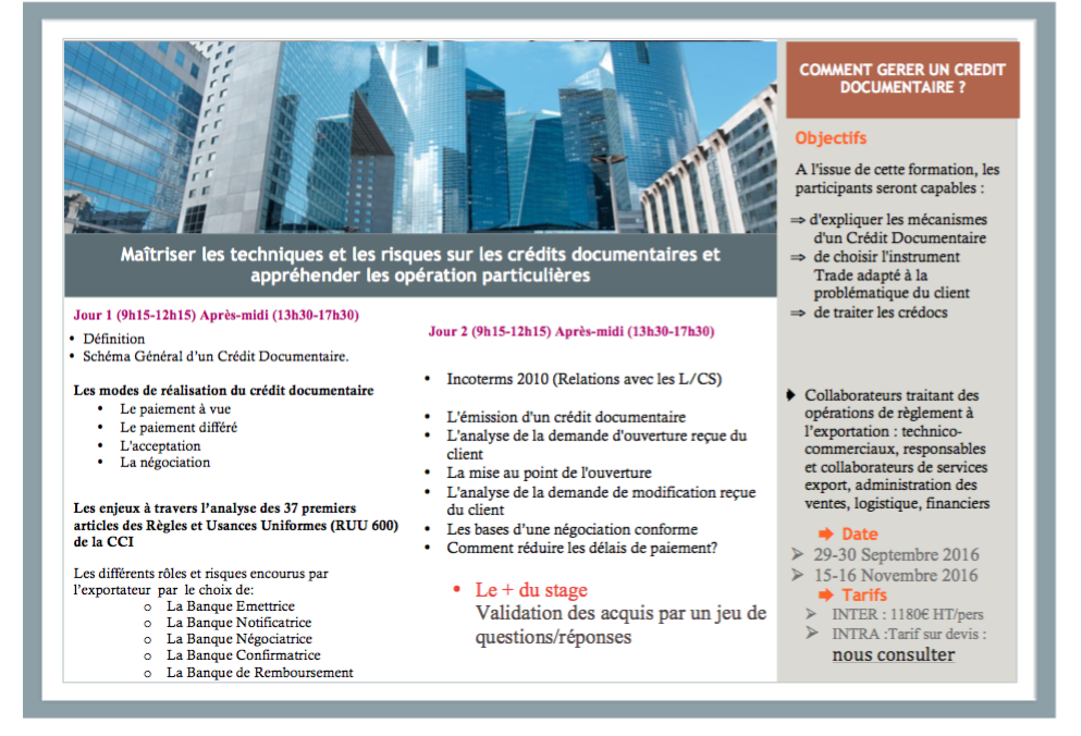 Session Formation » Comment Gérer un Crédit Documentaire ? » du 29-30 Septembre 2016